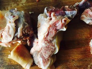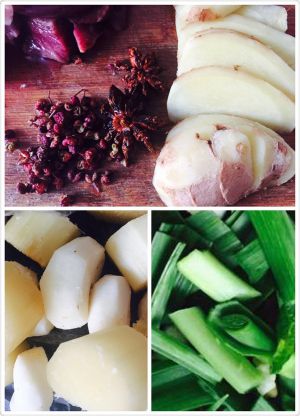 花椒、八角等配料都洗净;生姜切片,青蒜苗切末,马蹄、甘蔗、尖椒切片和段备用。
