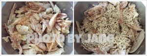 鸡肉加入香油、花椒粉,白芝麻炒香后加入鸡肉里