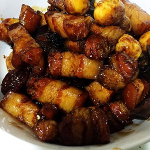 半小时后放炸好的鹌鹑蛋,在小火烧半小时,放冰糖大火收汁,翻炒下,金银剔透的红烧肉就出锅了