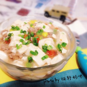 锅内放油,胡萝卜、玉米、豌豆粒下锅炒几下,再放切块的豆腐炒两下,放肉末,加点点水煮开,放盐和精,最后调入淀粉汁勾芡即可。