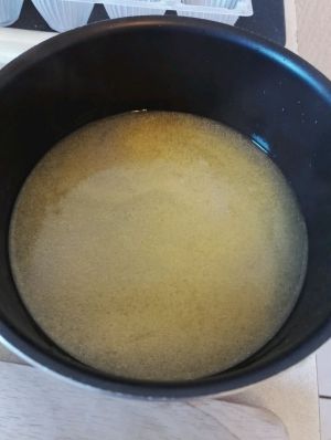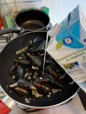 贻贝微微开口,倒入椰奶至贻贝三分之一即可。