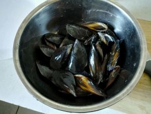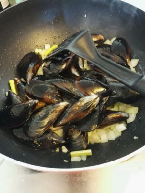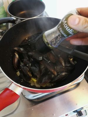放入胡椒。根据个人口味酌量。继续翻炒搅拌,至贻贝大开口再翻炒两三分钟即可。贻贝的烹煮,一定要把握时间,不要烹煮过久,这样可以保留贻贝的鲜嫩口感。