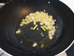 加入洋葱,蒜末,柠檬草翻炒爆香。