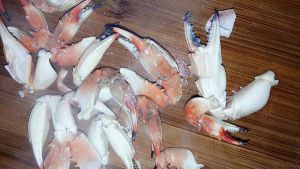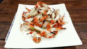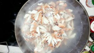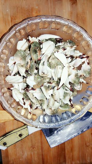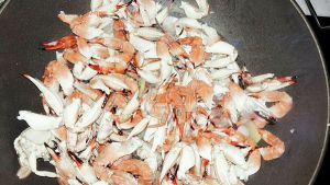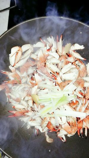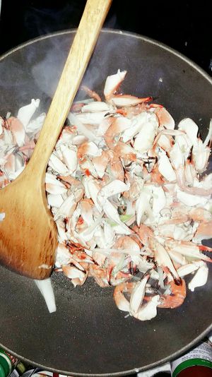 把蟹脚下锅翻炒,放料酒,多炒一会,让汁进入蟹脚