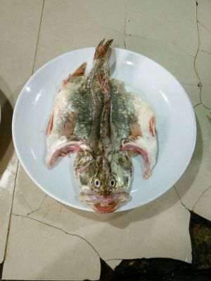 桂花鱼破肚去内脏,后摊开铺于盘子之上,打好花刀