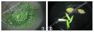 锅内坐水,加入小勺盐,滴入几滴食用油,水开后将青豆放入氽烫至断生,捞出控水备用;香干切丁备用。炒锅烧热注油,下姜片、蒜白段煸香。