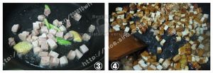 将白水煮熟的五花肉切丁(注意拭干肉面水分)入锅内煸炒至肉面微微焦香,喷小勺料酒翻炒出香。下香干丁,煸炒至香干子表皮焦香起泡。