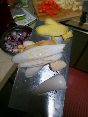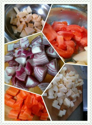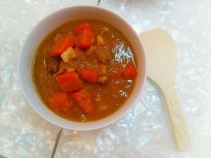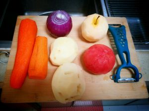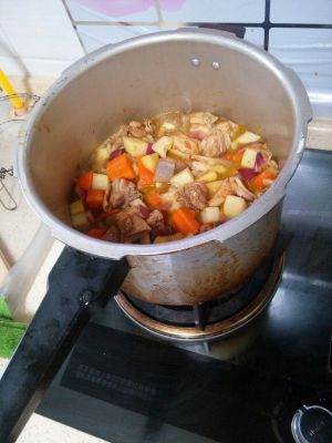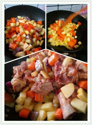 依次放入土豆(最不容易熟的)、胡萝卜、洋葱、苹果、西红柿(最容易熟的)、鸡肉,翻炒翻炒,最后放些盐、黑胡椒、咖喱粉、咖喱酱,调好味!