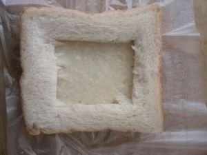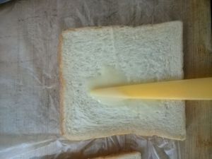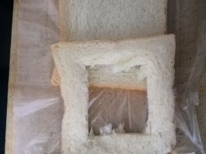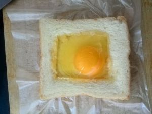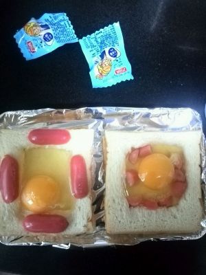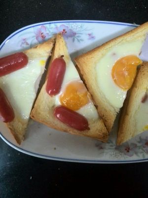 将肉枣摆至面包片周围,或者先放肉在再打鸡蛋~~看你想怎么吃了