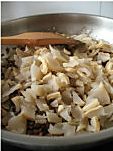 放入萝卜干小段,翻炒均匀,再依次放入少许盐和白糖,小火慢慢煸炒,直至萝卜干入味儿且软烂,即可。