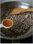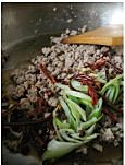 放入葱丝姜末和麻辣小料,转小火,煸炒至肉末变干,这时干香味扑鼻呢