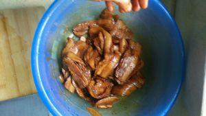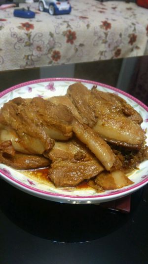 讲炸好得五花肉切片后放少许生抽和老抽和一点点白糖(因为我家不吃味精,所以用白糖代替)生姜片拌匀