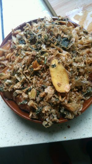 把发好的干菜用一点生抽上色,铺在摆好的五花肉上