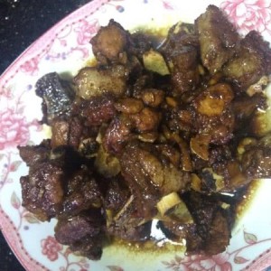 切点蒜蓉,姜丝,热锅下油下姜蒜炒,排骨倒下去翻炒一会,倒酱油,醋,老抽下去继续翻炒,倒可乐炒几下倒冷水,没过排骨,大火把水煮开,然后转小火继续煮,煮到快没汁关火上盘