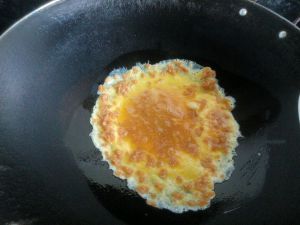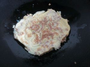热锅热油,混蛋下锅后转小火,不然很易焦糊…这个量看上去是不是刚好铺满…这样煎出来就蛋包脯,口感好!