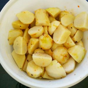 芋头仔去皮洗净切成小块,放进可微波的容器,盖上盖,高火三分钟。