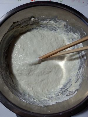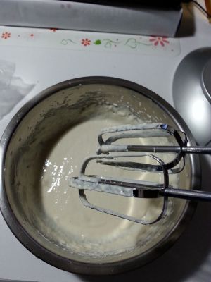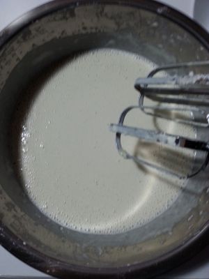 130g水分3次加入到面糊中,每次都有打蛋器1档将水、面融合后再加水