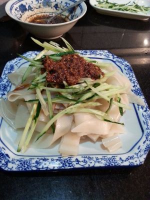 放些黄瓜丝、用水绰熟的黄豆芽、绰过水青菜等等,再放上蒜水汁