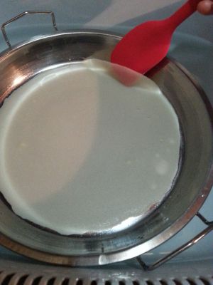 用勺子搅匀面水后,舀一勺倒入抹了油的其中一个锣锣里,两手摇动锣锣是面水均匀的铺满锣的底层
