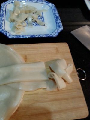 平铺到案板上【这时再将第一个锣锣上抹上一层薄油】,准备进行第二轮 工作,以此类推,将所有面水蒸完