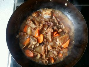 加开水,胡萝卜,加盖大火烧5分钟改小火。(一定是开水,不然影响肉质的口感)