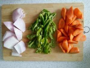 胡萝卜,青椒,洋葱滚刀切成小块,洋葱要切大点(洋葱炒时会变小)。