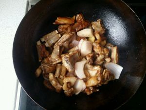 锅里加油烧到5层热时加冰糖,等冰糖慢慢融化变成焦糖色起泡泡时,放羊肉。
