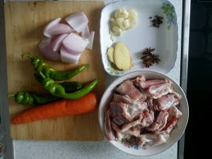 羊肉1kg,胡萝卜1根,青椒4个,洋葱半个,姜,大蒜,花椒,八角适量。