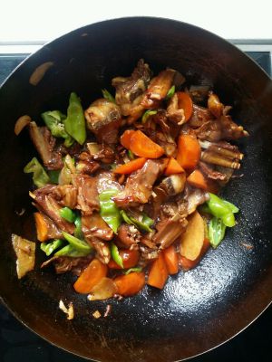 等水烧干只剩油时,加盐、青椒大火爆炒。
