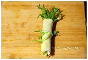 将干豆腐皮卷好,用一根苦菊系上固定即可.
