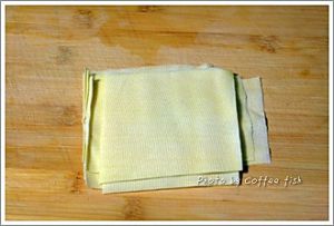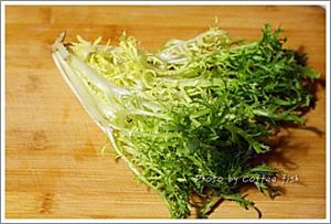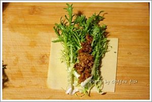在干豆腐皮上放上几根苦菊和少许鸡蛋酱.