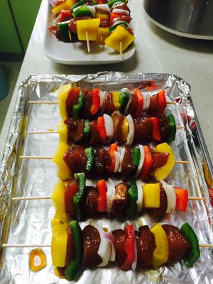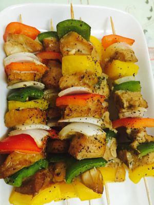 将腌制过的鸡肉一块一块和彩椒洋葱串好,入烤箱前撒上现磨黑胡椒粉,烤箱预热189度,20分钟左右