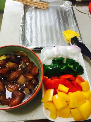 彩椒和洋葱切块备用,竹签放沸水中煮一下捞起备用,烤盘铺上锡纸,再薄薄刷上一层油