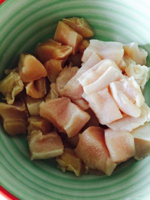 鸡胸脯洗净沥去水分,切成小块,加酱油、蚝油、料酒、蜂蜜,用手抓匀后放冰箱冷藏两个小时