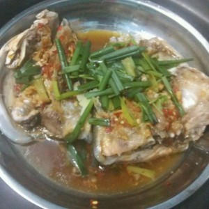 买回鱼头洗好,放盐,姜,自炸蒜米
