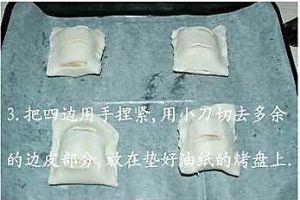 切掉四边多余的酥皮,把香蕉派放在垫油纸的烤盘上.