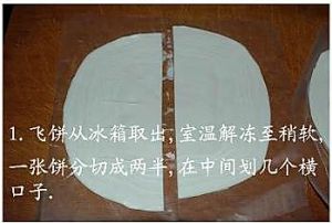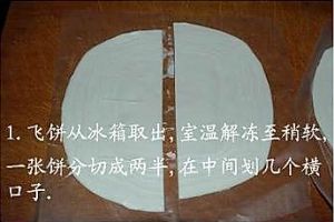 把飞饼从冰箱冷冻室取出,室温解冻到有点软了,把飞饼一开二,在当中横的划