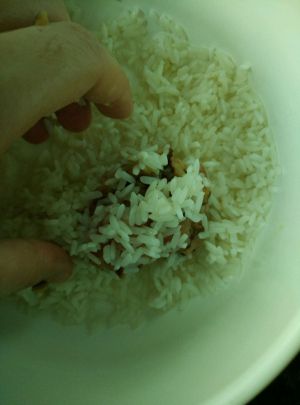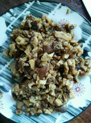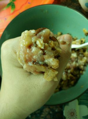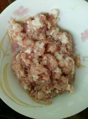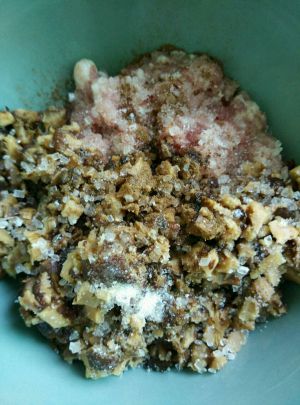 猪肉香菇混合,加入适量的油、盐、糖、五香粉,搅拌均匀