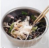 泡好的木耳焯水,过冷水,去掉根蒂,挤干水份。