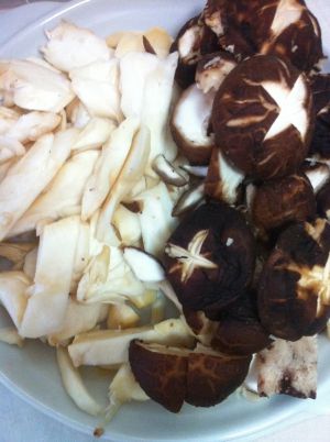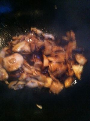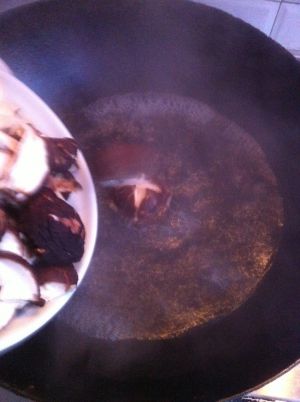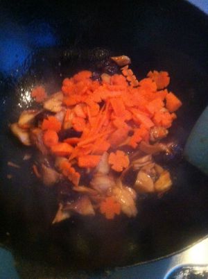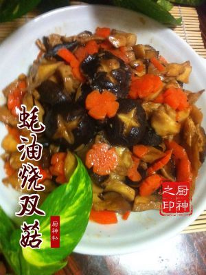 锅底放油葱炝出香味下双菇,蚝油,白胡椒,生抽煸烧片刻。