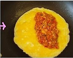 鸡蛋加入几滴生抽打散,热锅少油小火将蛋液煎成半凝固状时放入炒好的馅料;