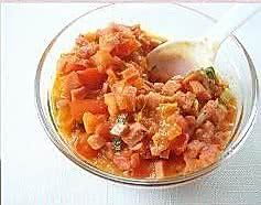 西红柿半个、熏肉火腿肠一条切粒,热锅加油炒香,葱花和火腿粒,加入西红柿粒炒半分钟,加胡椒调味;