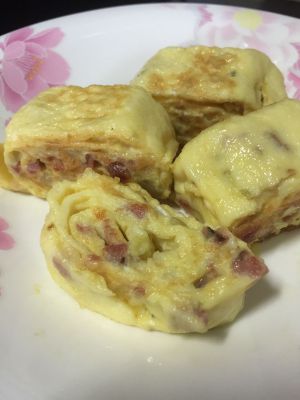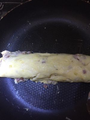 将蛋液倒进不粘锅,等到有一点变色的时候,卷起来,然后在空白的地方继续倒蛋液,继续卷,直至蛋液用完