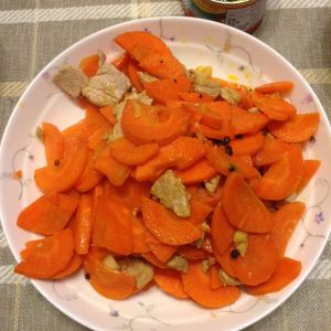 加入胡萝卜片后,酌情撒上盐,开至大火翻炒,待或萝卜片至稍软时出国即可。