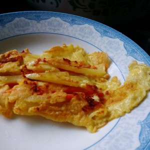 鸡蛋打碎,放少许水,放入面粉,搅拌均匀,放入土豆丝和胡萝卜丝