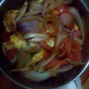 翻炒一会,看着洋葱和西红柿都熟的差不多了,开始放入刚刚煎好的鸡蛋,放入调料,美味的一道菜马上出锅了!