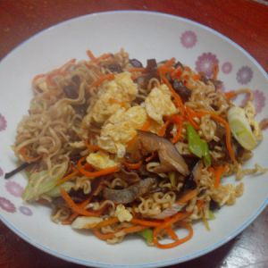 大葱、胡萝卜、香菇切丝,热油锅炒鸡蛋,再下大葱、胡萝卜丝、香菇。
