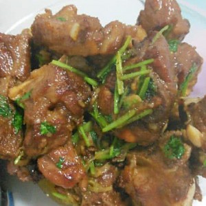 当汤汁还有一点的时候放入蒜末,香菜,然后开大火翻炒,直到汤汁收干,美味的红烧排骨那就大功告成啦