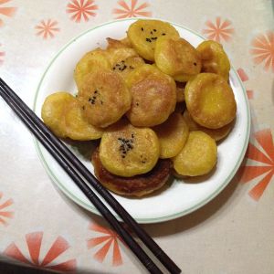 用勺子绞碎南瓜成糊状,然后加入糯米粉,搅匀