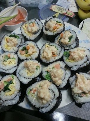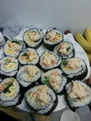 卷帘上放一片紫菜,紫菜上均匀涂上米饭(薄薄一层),把黄瓜条、香肠、胡萝卜丝、菠菜、烙四个鸡蛋饼(一片紫菜里面均匀放一份摊好的鸡蛋),涂上金枪鱼沙拉酱,放在(涂好的)米饭的上,用卷帘紧紧卷在一起,用刀切成段。(菠菜和胡萝卜处理:菠菜水焯一下放点盐,胡萝卜切丝放醋、盐放半小时)